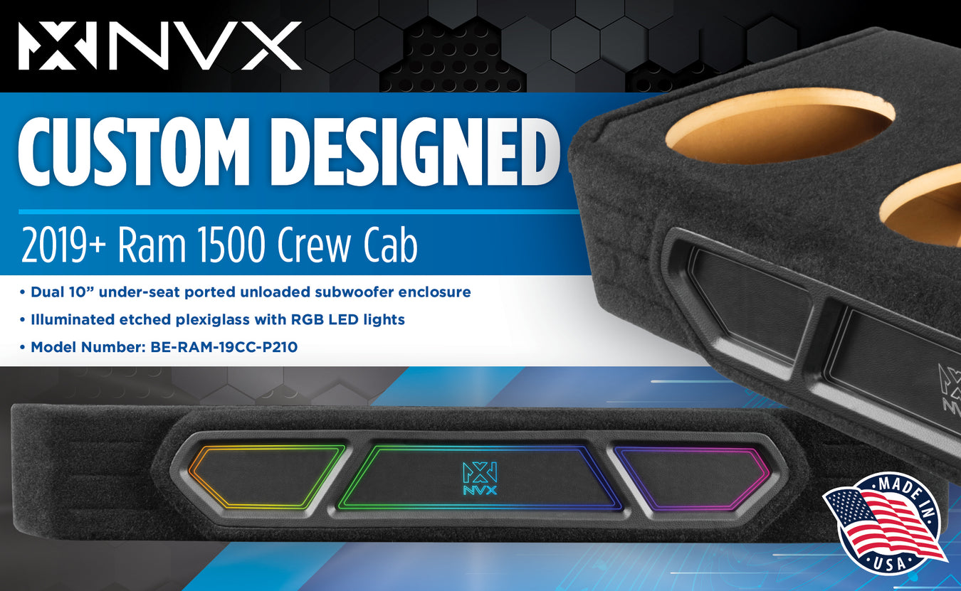 Custom Dual 10" Under-seat Ported Unloaded Subwoofer Enclosure with LED Lighting for 2019-2024 RAM 1500 Crew Cab Trucks | BE-RAM-19CC-P210