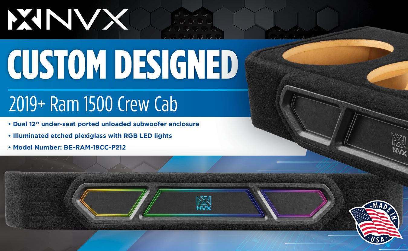 Custom Dual 12" Under-seat Ported Unloaded Subwoofer Enclosure with LED Lighting for 2019-2024 RAM 1500 Crew Cab Trucks | BE-RAM-19CC-P212